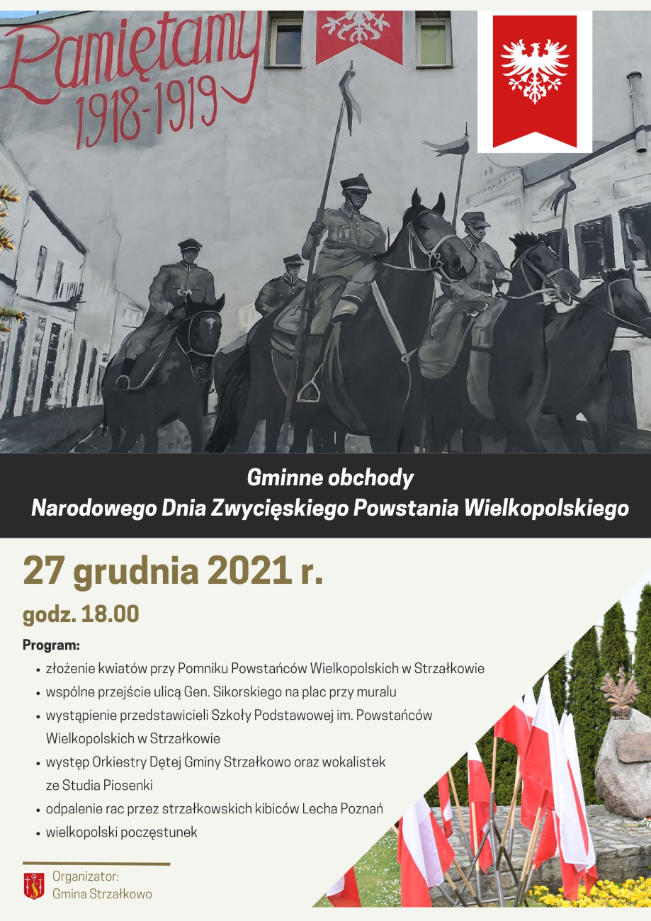 W poniedziałek, 27 grudnia o godz. 18.00 w Strzałkowie odbędą się gminne obchody Narodowego Dnia Zwycięskiego Powstania Wielkopolskiego. Szczegóły poniżej na plakacie.