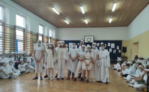 Podsumowany został projekt edukacyjny pt. „Bal wszystkich świętych” zainicjowany i zorganizowany przez panią Mariolę Wiśniewską na lekcjach religii w klasach IV-VIII. Uczniowie poznawali biografię świętych, przygotowali okrzyk świętych, lapbook, plakat, uczyli się piosenek oraz tańczyli belgijkę. Tego dnia wszyscy przebrali się za aniołki, było mnóstwo radości śmiechu i dobrej zabawy. Reprezentanci klas doskonale wcielili się w postaci świętych. Jakub Loritz przybliżył biografię św. Józefa, Nikola Wesołek ukazała św. Katarzynę Aleksandryjską, Szymon Wróblewski – bł. Stefana Wyszyńskiego a Piotr Mrugalski – Jana Pawła II. Ostatnim punktem programu był quiz o świętych, budził on wiele emocji; klasy z zainteresowaniem czekały na odpowiedzi swoich przedstawicieli. Klasowe rywalizacje oceniała i podsumowała komisja, w składzie p. dyrektor M. Strzelecka, p. I Miętkiewicz i p. E. Kalisty. Przyznano I miejsce – klasie VI/VII, II miejsce – klasie V, a III miejsce- klasie VIII.