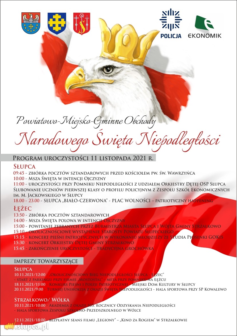 Samorządy Gminy Strzałkowo, Powiatu Słupeckiego i Miasta Słupca organizują wspólne obchody Narodowego Święta Niepodległości. Punktem kulminacyjnym uroczystości będzie polowa msza św. w intencji Ojczyzny, która zostanie odprawiona 11 listopada o godz. 14:00 w Miejscu Pamięci w Łężcu. Po jej zakończeniu tradycyjnie odbędzie się krótki koncert pieśni patriotycznych i występ Orkiestry Dętej Gminy Strzałkowo. Dla wszystkich uczestników przewidziana jest grochówka. Szczegóły obchodów na plakacie.